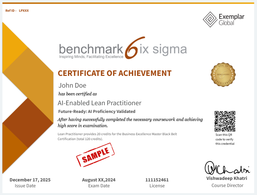 This sample certificate is shown to illustrate the format and design of the Lean Practitioner and Lean Guide (LPLG) Certificate