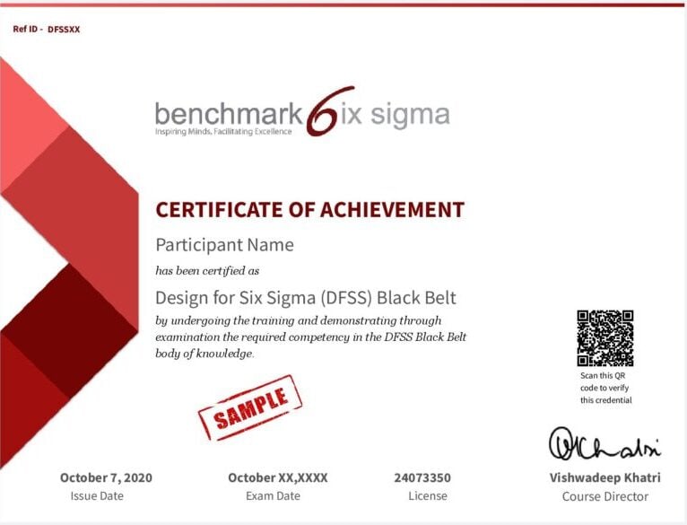 - Formal evaluation (exam/assessments) ensuring you’ve mastered DFSS techniques and best practices.