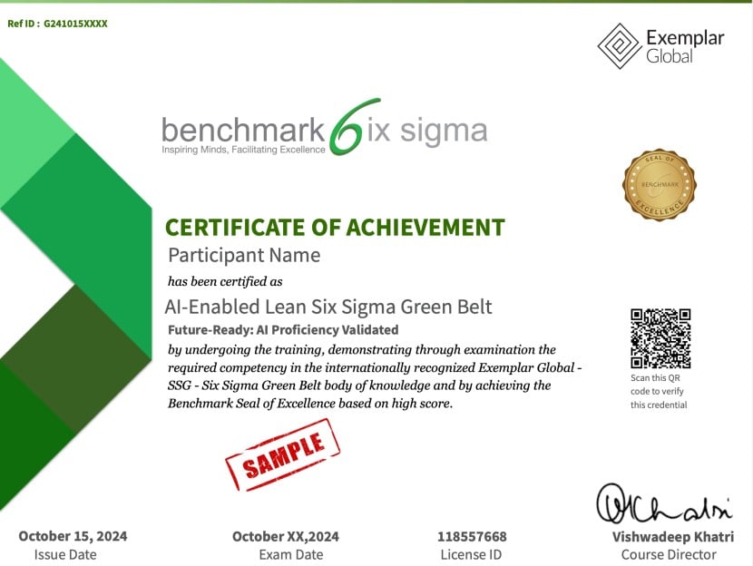 - Globally Recognized Certification (Lifetime Validity) — Lean Six Sigma Green Belt certification accredited by Exemplar Global, providing international recognition, with lifetime validity reflecting confidence in the enduring nature of structured problem-solving capability.